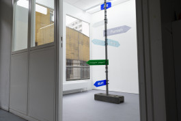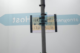 The 2nd rendition of Signpost, a new series of site-specific sculptures by Eknæs and Vergueiro, locates topics that hover and problematize Fächer’s surrounding area. Zip-tied to a post, some signs are transparent, others copy street signage colors, as they disguise their form to (mis)direct the public’s awareness of their own presence at Fächer.