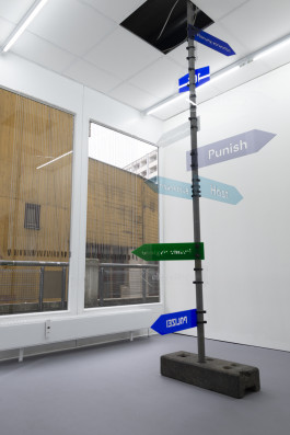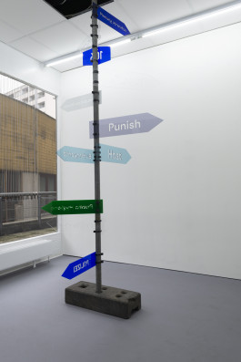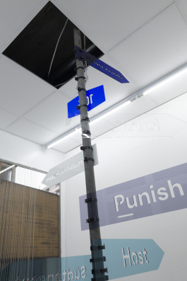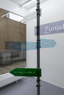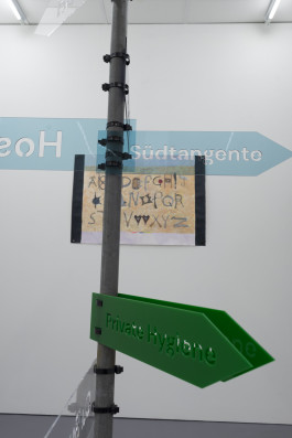 Two signs point out the pieces in the show: Punish (Alphabet) and Private Hygiene. Other signs: Polizei, 106, Planung Verworfen, Südtangente point to the newly inaugurated police station and the discarded Autobahn and its imagined demarcation. Additional signs refer to other characteristics of the area: Public Hygiene, the title of an older brush piece by Eknæs, takes on a plea for Kotti’s scruffy landscape; Cu Bucetão is a playful and crude nickname Brazilians in Berlin call Kottbusser Tor – a phonetic Portuguese translation meaning ‘asshole big pussy’; and Host conjures the gallery, neighborhood or an unseen force as an invaded or dominating body. Signs Cloud and Wolf 1069b – a newfound exoplanet speculated to have habitable conditions similar to Earth, dislocate awareness beyond the vicinities of Fächer.