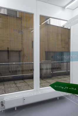 The piece on the façade window of Fächer is made up of several small brushes hanging from long metal coils, intended to clean the innards of refrigerators. Eknæs’ ongoing ‘brush pieces’, started in 2013, here is downscaled to a more discrete form. Her Public Hygiene 3, 2018, consisted of a 150cm tall, factory bought street cleaning brush hanging from the ceiling of Kölnischer Kunstverein. Like a voluminous and bright chandelier, the piece brought the topic of maintenance of the shared urban landscape into the gallery space. Private Hygiene shifts this insight to domestic maintenance, as the diminutive leashed brushes allude to their snaking their way into inconspicuous orifices to clean invisible spaces. Private Hygiene doubles as a decorative window treatment and as an imminent threat for intrusive sanitation.